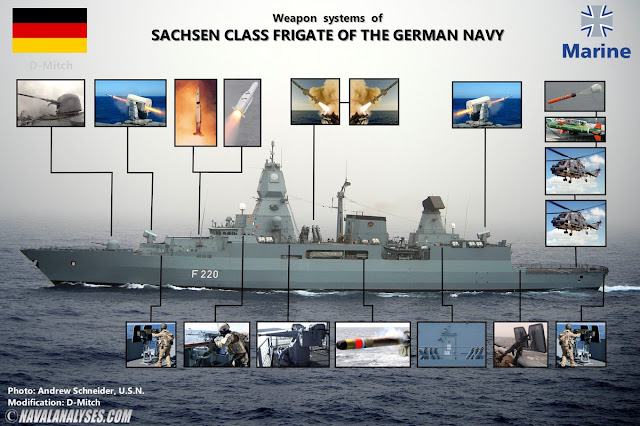 Le fregate lanciamissili classe “F124 o Sachsen” sono tra le ultime unità tedesche di difesa aerea altamente avanzate. Il design si basa su quello della precedente classe F123 Brandenburg ma con funzionalità stealth avanzate progettate per ingannare i radar ed i sensori acustici dell’avversario. La classe incorpora un avanzato radar multifunzione APAR e un radar a lungo raggio SMART-L che si presume sia in grado di rilevare velivoli e missili stealth.