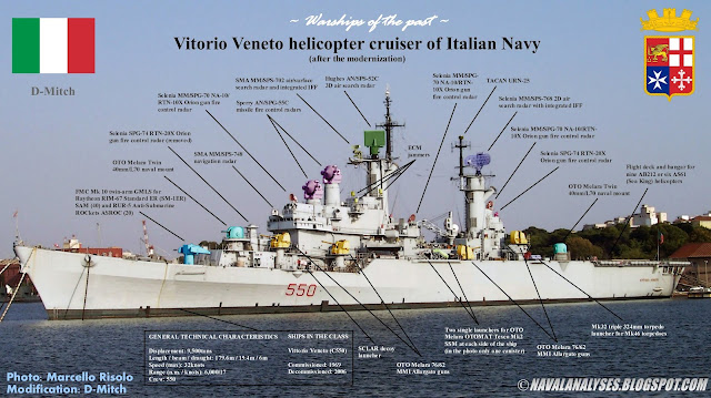 This ship has the same general layout as the smaller Andrea Doria-class helicopter cruisers, but with two elevators in the flight deck and the hangar below, rather than with the hangar as part of the superstructure. It was named for the decisive Battle of Vittorio Veneto which ended World War I on the Italian front.