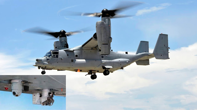 In 2014, the USMC studied new weapons with "all-axis, stand-off, and precision capabilities", akin to the AGM-114 Hellfire, AGM-176 Griffin, Joint Air-to-Ground Missile, and GBU-53/B SDB II. In November 2014, Bell Boeing conducted self-funded weapons tests, equipping a V-22 with a pylon on the front fuselage and replacing the AN/AAQ-27A EO camera with an L-3 Wescam MX-15 sensor/laser designator. 26 unguided Hydra 70 rockets, two guided APKWS rockets, and two Griffin B missiles were fired over five flights. The USMC and USAF sought a traversable nose-mounted weapon connected to a helmet-mounted sight; recoil complicated integrating a forward-facing gun. A pylon could carry 300 lb (140 kg) of munitions. However, by 2019, the USMC opted for IDWS upgrades over adopting new weapons.