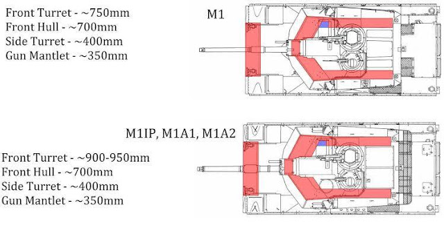 Per il modello base dell’M1 Abrams, Steven J. Zaloga fornisce una stima dell'armatura frontale di 350 mm rispetto a scudo-sabot anti-armatura con perforazione stabilizzata (APFSDS) e 700 mm contro la testata anti-tank ad alta esplosività (HEAT) in M1 Abrams Main Battle Tank 1982-1992 (1993).