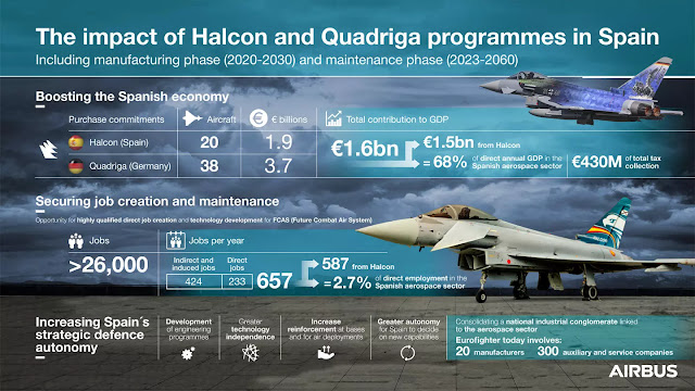 Si prevede che i contratti spagnoli Halcon (20 Eurofighter per l’aeronautica spagnola) e tedeschi Quadriga (38 Eurofighter per la Luftwaffe) contribuiranno con quasi 1,7 miliardi di euro al PIL spagnolo, con la produzione e la manutenzione dell’Halcon che genereranno circa 1,5 miliardi di euro e la produzione di Quadriga costituendo i restanti 200 milioni di euro.